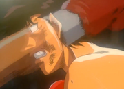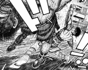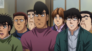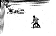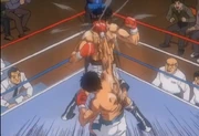 When the match against Kobashi began, in the first three rounds, Ippo had trouble with Kobashi's left arm sticking out. Ippo was unable to hit him and was getting exhausted as Kobashi kept clinching. In the fourth and last round, Kobashi began to throw more punches than usual, hoping for a KO win after hitting with s clean one-two, Ippo saw an opening and threw a clean hit to the face that downed Kobashi. As Kobashi was unable to stand, Ippo won the match. Ippo then watched Takamura's match against Yoshiaki Yajima. When Takamura went down, Ippo and the others cheers helped Takamura stand back up. The match then ended with Takamura winning.