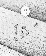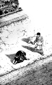 As Takamura stated, Ippo's inability to make excuses to stand up and keep fighting is proof that he doesn't have what it takes to "cross the line" and reach the world.[106]