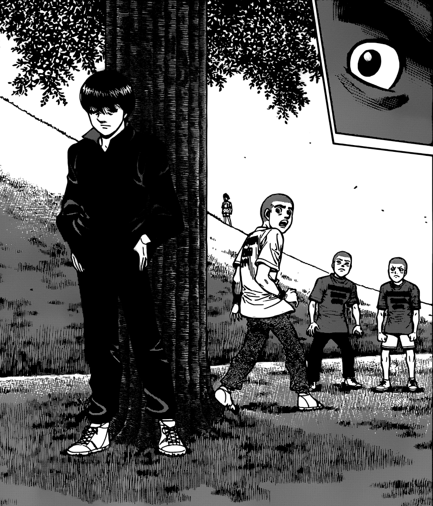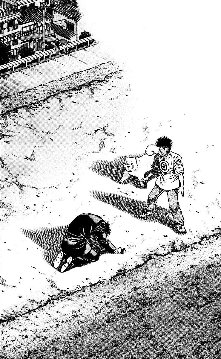 After being bullied by Masahiko Umezawa, Takemura and Matsuda, Ippo was saved by novice boxer, Mamoru Takamura, who drives the trio away. An unconscious Ippo is then taken to the Kamogawa Boxing Gym, where he is nursed back to health by Takamura. Before letting Ippo go, Takamura gave him the opportunity to punch a heavyweight bag with a drawing of Umezawa's face on it. After following Takamura's instructions, Ippo successfully performed a straight on the sandbag. Ippo's power was such, that the skin on his hand is peeled after hitting the sandbag. While bandaging Ippo's hand, Takamura noticed his well-built body and encourages him to defend himself from the gang. Before leaving, Takamura gave him a video compilation of Mike Tyson's knockouts.