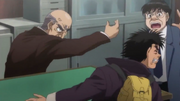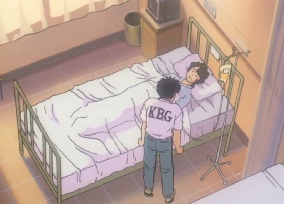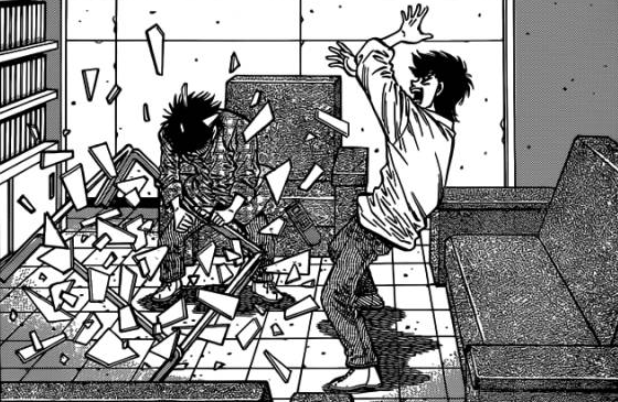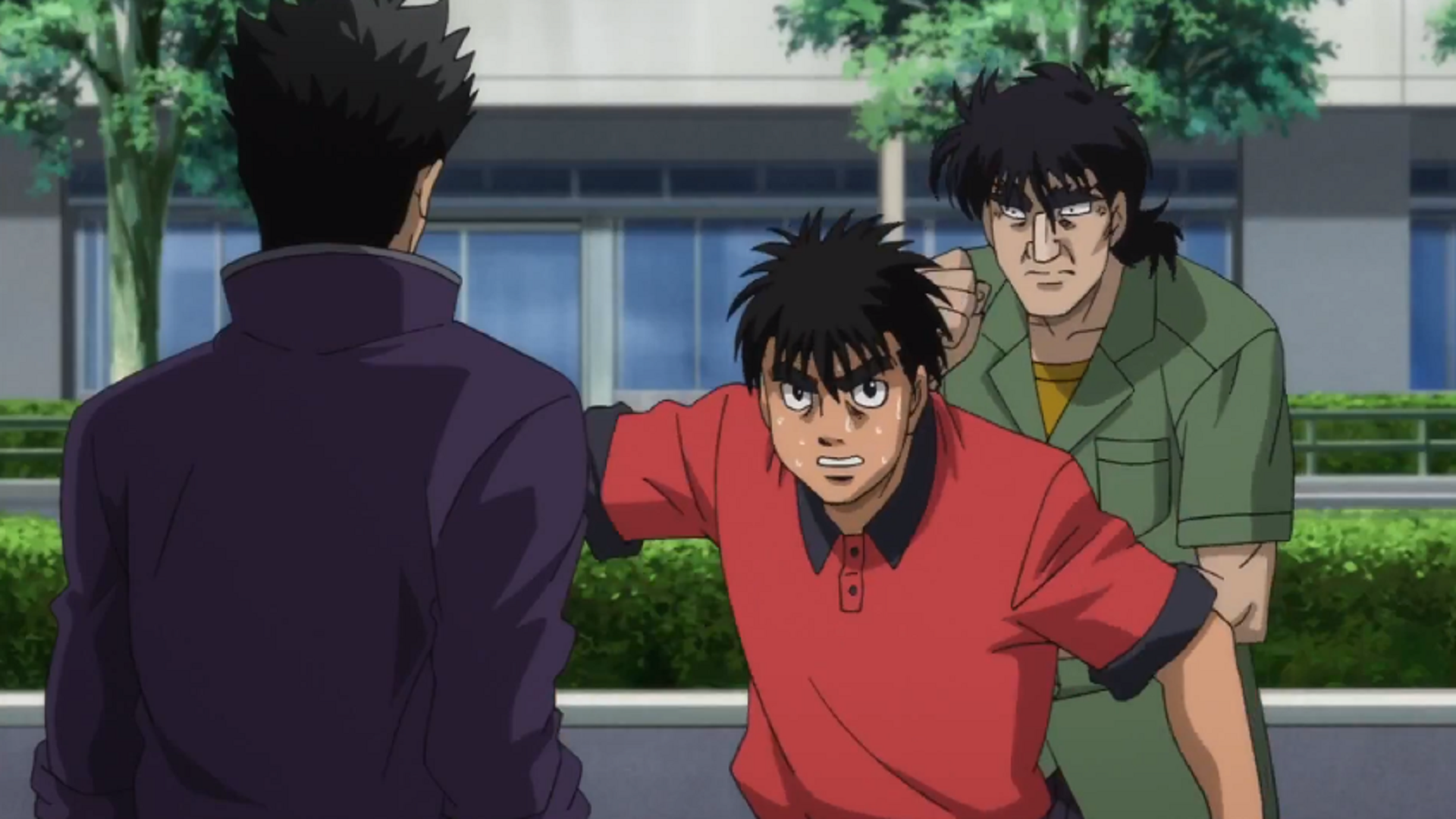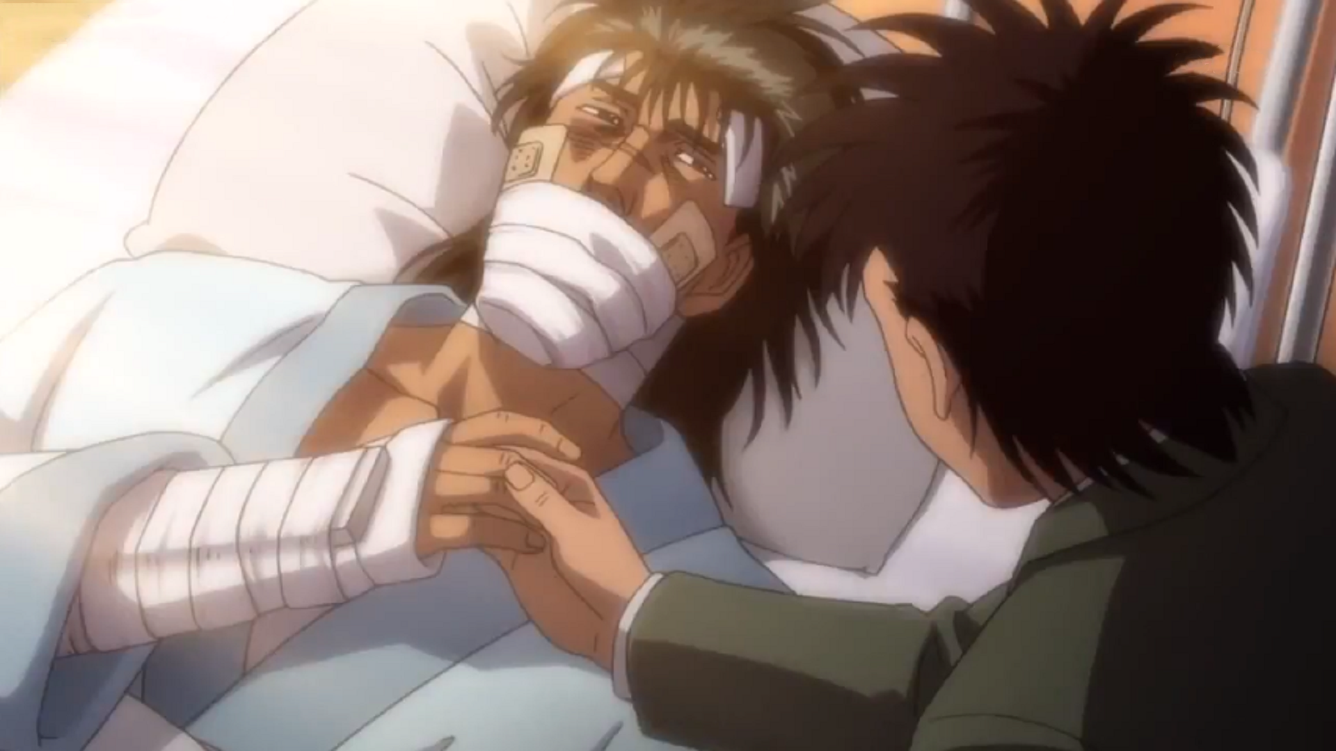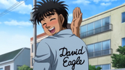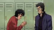 After watching the match between Miyata and Mashiba, Ippo received a message from Miyata, who lost the match, saying to forgive him. Ippo, frustrated, punched a sand bag at the gym until he was stopped by Takamura who discovered his bloodied fist. After looking at the wounds on Ippo's fist, Kamogawa suggested he must not use his fist for two weeks. Ippo then began training focused on his speed.