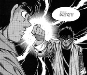 Even before being introduced to the Kamogawa gym, Ippo showed an early aptitude for boxing by learning on his own how to replicate the form and speed of a jab by single-handedly catching multiple fallen leaves, greatly surpassing Takamura's expectations.[68] Before turning pro, Ippo learned how to perform the many basic techniques of boxing under the tutelage of Kamogawa, and was able to surprise the experienced mentor with his proficiency for uppercuts.[69] Within a year of training, Ippo successfully accomplished his goal of becoming a professional boxer.[70]