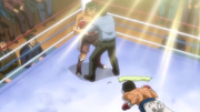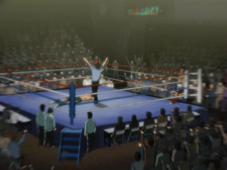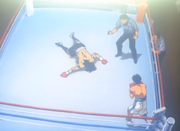 The match against Ozuma began, and in the first round, both Ippo and Ozuma were on the same pace, dodging each others punches, however Ippo was hit by one of Ozuma's hooks and went down. In the second round, Ippo went down due to a hook. After exchanging punches, Ozuma threw a large hook, Ippo dodged and threw a body blow, knocking Ozuma down. After getting back up, Ozuma threw multiple punches to Ippo, winning the exchange. Ippo, running out of options near the rope, saw an opening as Ozuma threw a hook, Ippo dodged and threw an uppercut and a combo that knocked out Ozuma, winning the match.