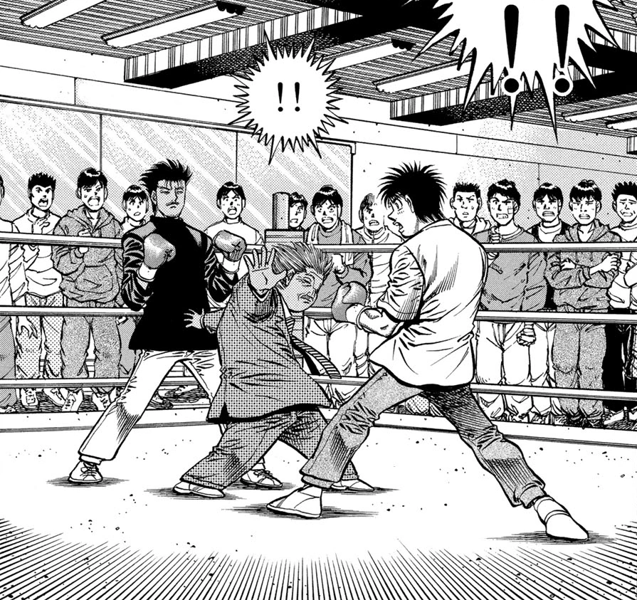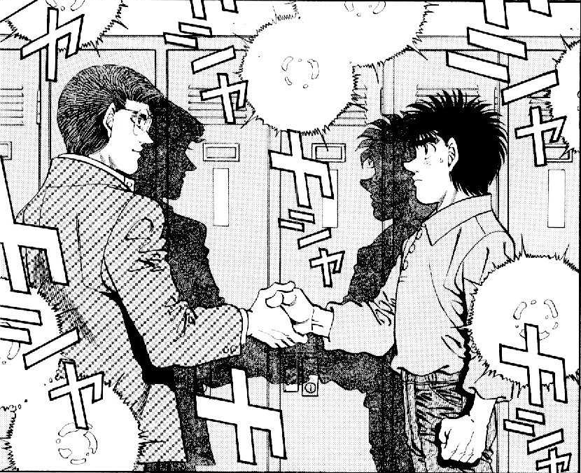 Believing Ippo to not be boxing material, Genji Kamogawa had him spar against prodigy out-boxer Ichirō Miyata, in order to see whether he could be accepted or not. Terrified at the idea of an actual fight, Ippo followed the advice of Takamura, who served as his second in the match. Utilising everything he had learned from Takamura, Ippo managed to get to the third round, surprising all witnesses. However, he fell into a trap and was caught by Miyata's counter. Despite losing the spar by knockout, Ippo's great determination earned him Kamogawa's respect and acceptance.